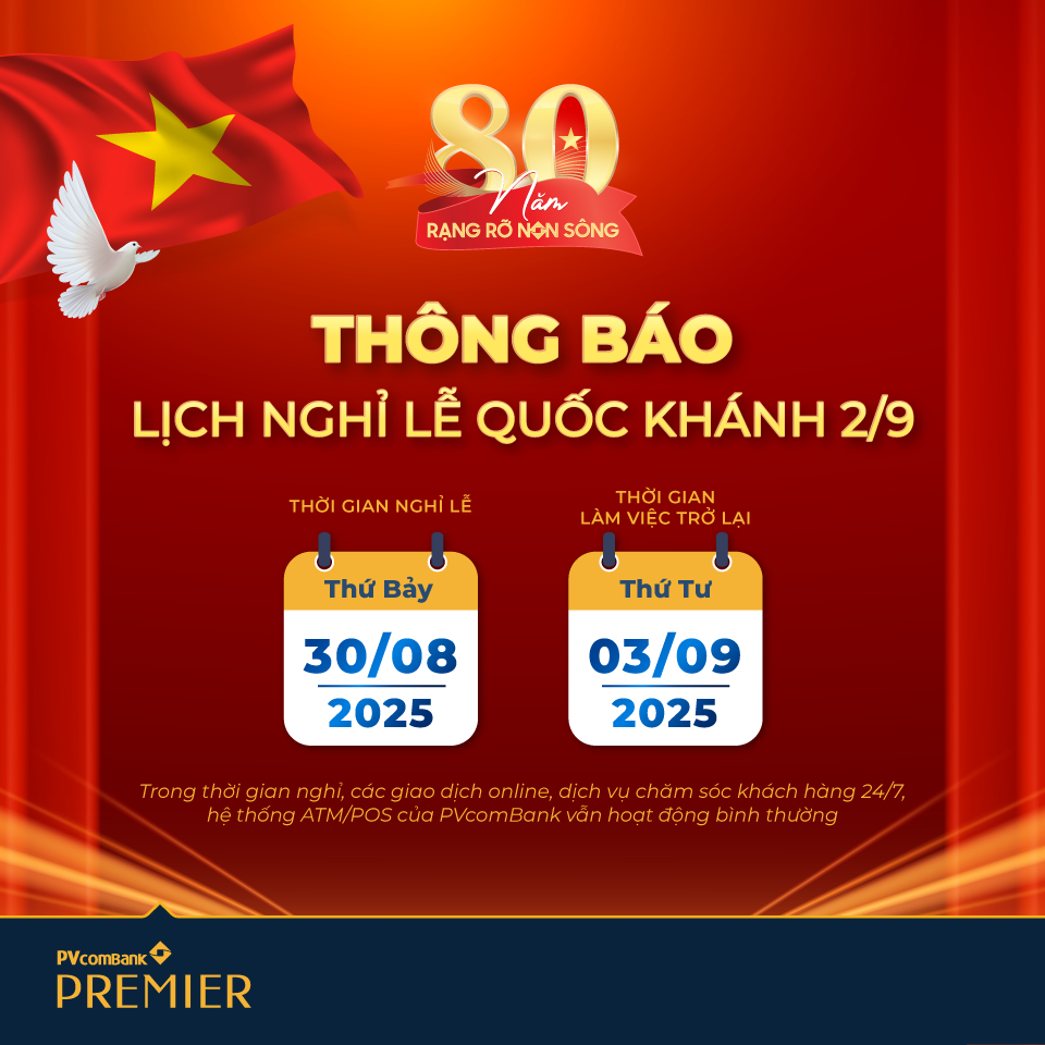 Ngân hàng TMCP Đại Chúng Việt Nam (PVcomBank) trân trọng thông báo tới Quý Khách hàng, Quý Đối tác lịch nghỉ lễ Quốc khánh 2/9 năm 2025, cụ thể như sau:
