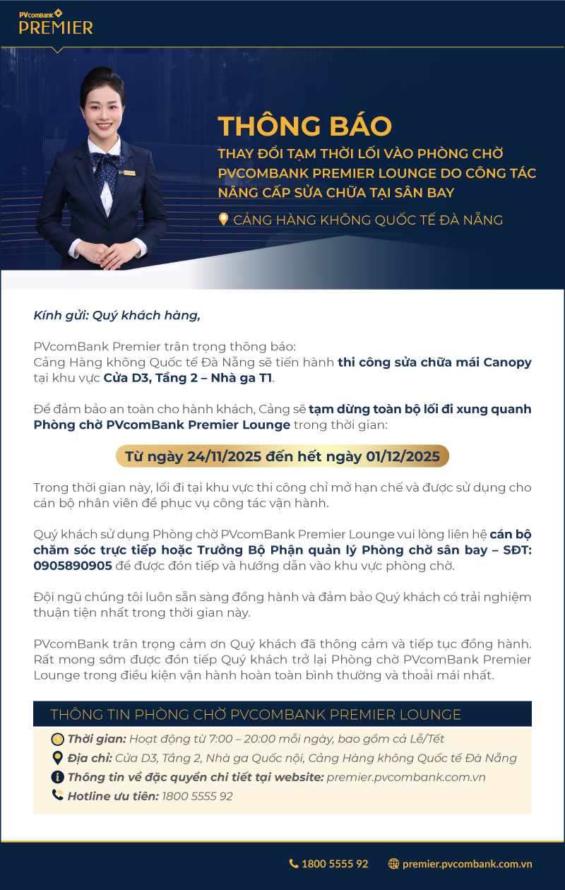 Thông báo thay đổi tạm thời lối vào phòng chờ PVcomBank Premier Lounge do công tác nâng cấp sửa chữa tại sân bay