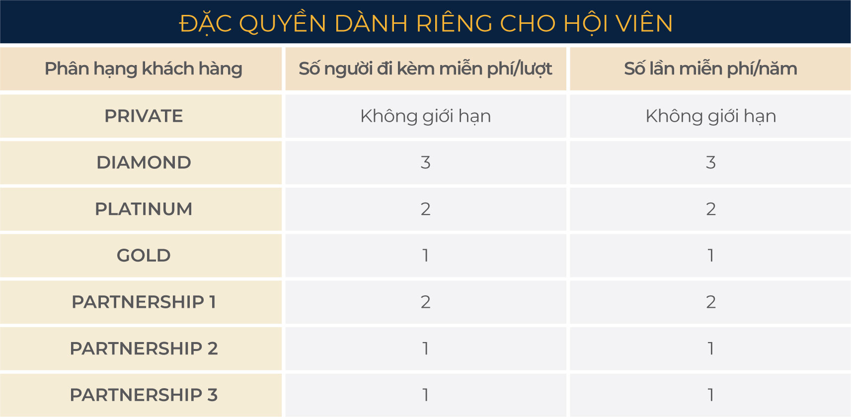 - Khách hàng là Hội viên được hưởng ưu đãi sử dụng dịch vụ Phòng chờ sân bay tương ứng theo từng phân hạng: