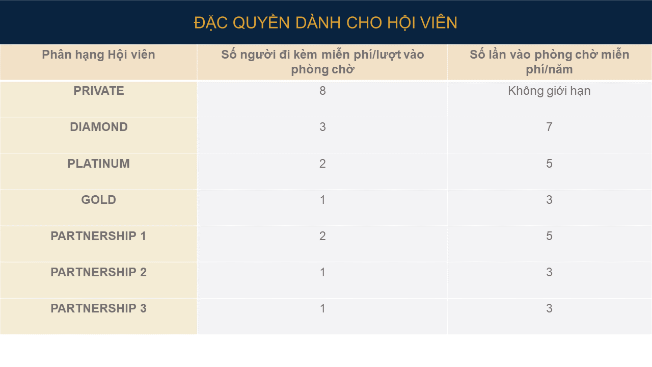 - Khách hàng là Hội viên được hưởng ưu đãi sử dụng dịch vụ Phòng chờ sân bay tương ứng theo từng phân hạng: